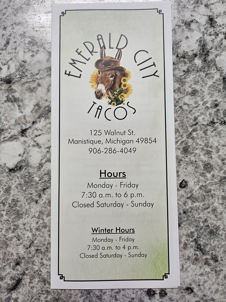 $20 Certificate is good for the purchase of any meal in the restaurant. Give your day some spice! Emerald City Tacos in Manistique has the flavor that’ll keep you coming back for mas! 125 Walnut Street, Manistique. Open Monday through Friday 7:30 – 4:00. Call 906-286-4049. Door dash is available!