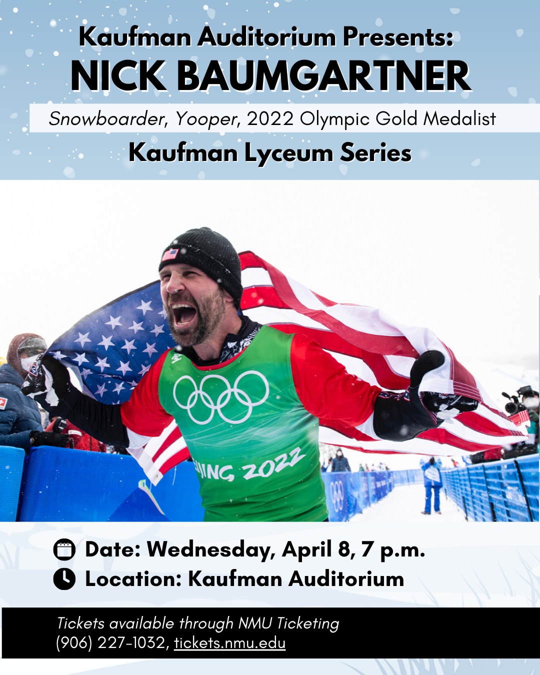 The Kaufman Lyceum series proudly presents Nick Baumgartner, snowboarder, Yooper, and 2022 Olympic gold medalist. He will be speaking Wednesday, April 8th at 7pm at the Kaufman Auditorium in Marquette.